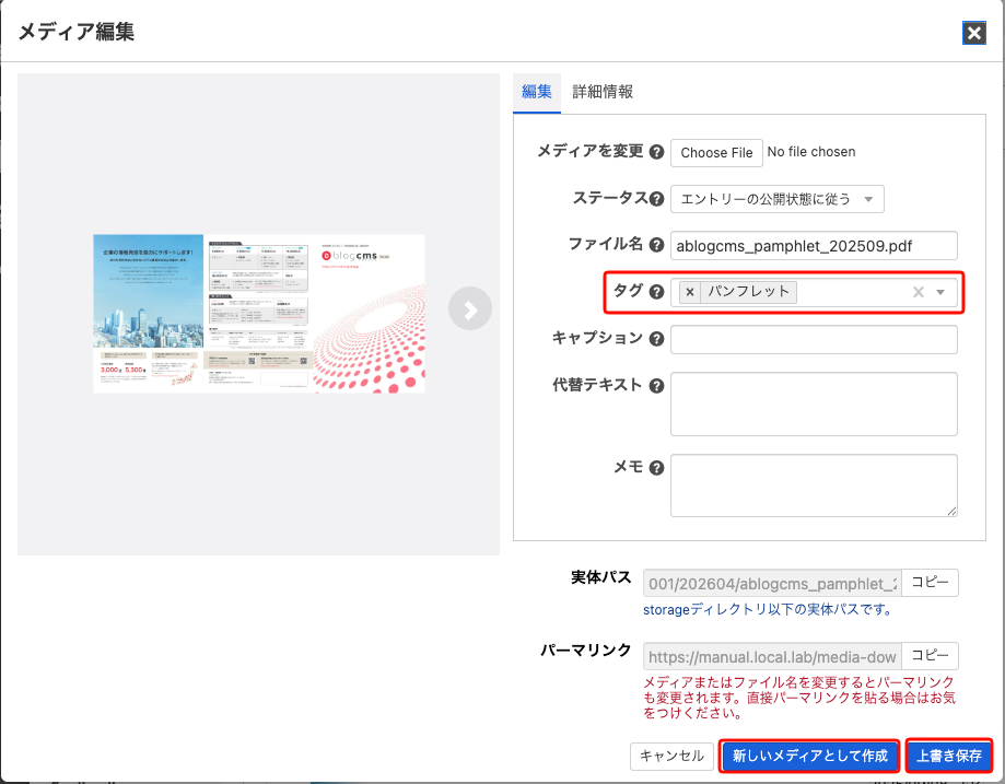 各メディアにはタグを設定しておくと、あとで検索しやすくなります。メディアを編集する際に[新しいメディアとして作成]をクリックすると、編集前のメディアとは別のメディアとして保存され、これまでのエントリー等に影響が出ません。[上書き保存]をクリックすると、メディアに編集が保存され、そのメディアが使われていた箇所全てに変更が反映されます。