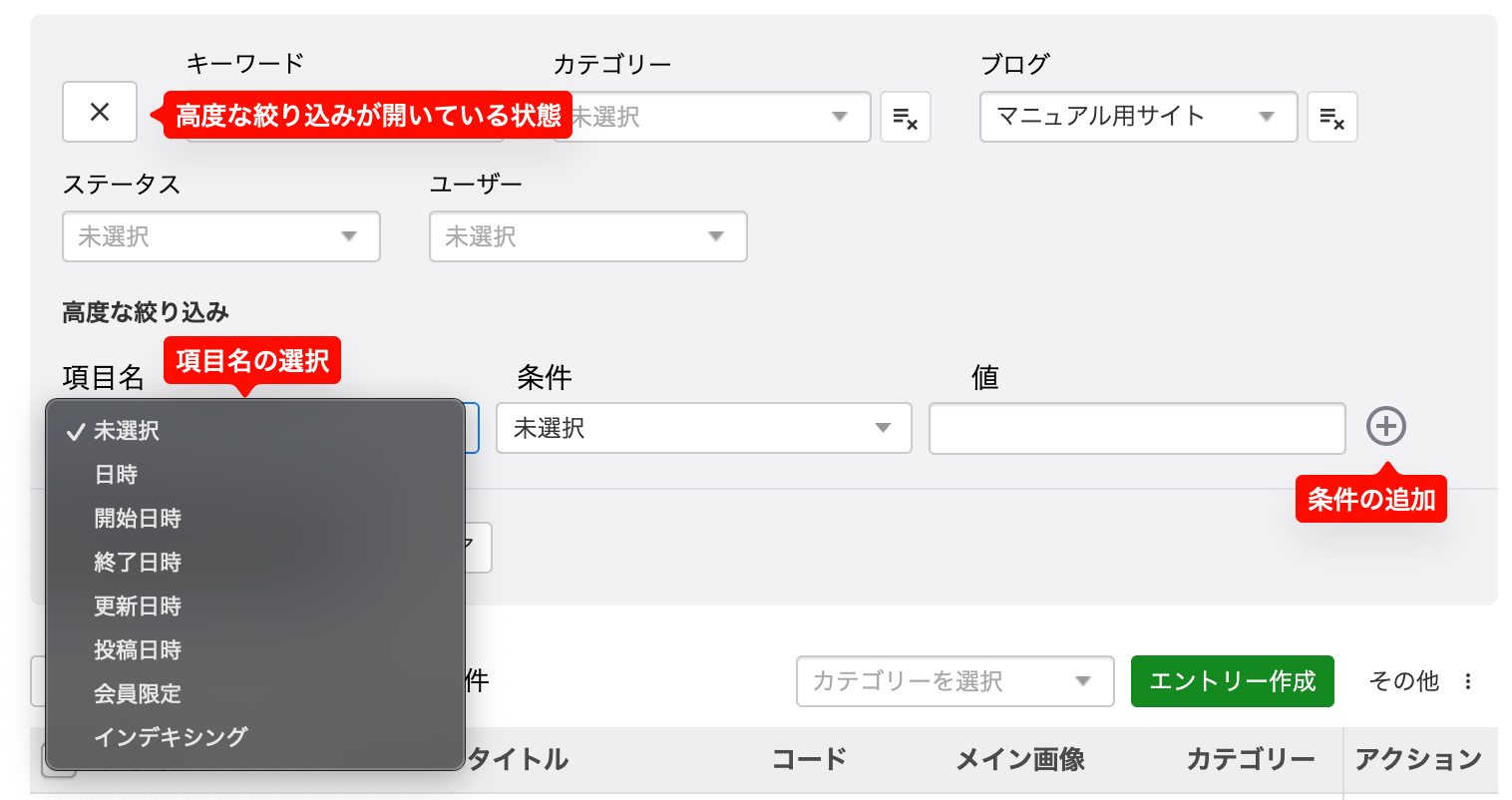 「高度な絞り込み」を開いた状態では、各種日時、会員限定、インデキシング等のより細かい項目での絞り込みが可能です。条件を追加すると複数条件での and 検索も可能です。
