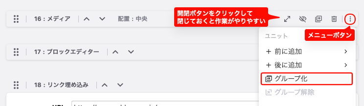 グループユニットに入れたいユニットをあらかじめ閉じておくと作業がしやすくなります。右端のメニューボタンをクリックし、「グループ化」を選択します。
