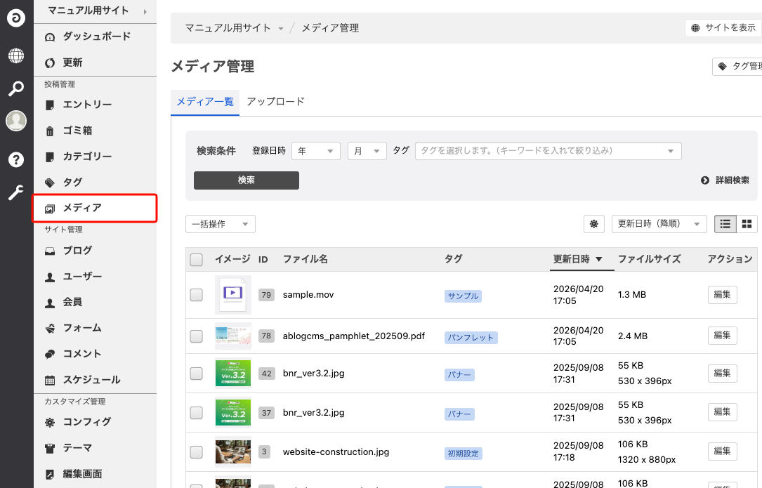 いったんアップロードされたメディアはメディア管理に登録されています。これによって、画像やファイルを使い回すことができます。