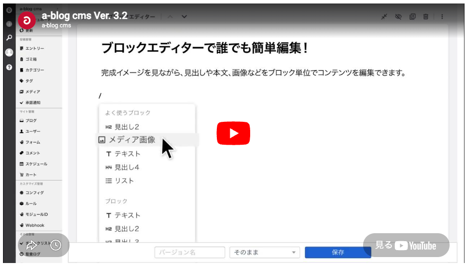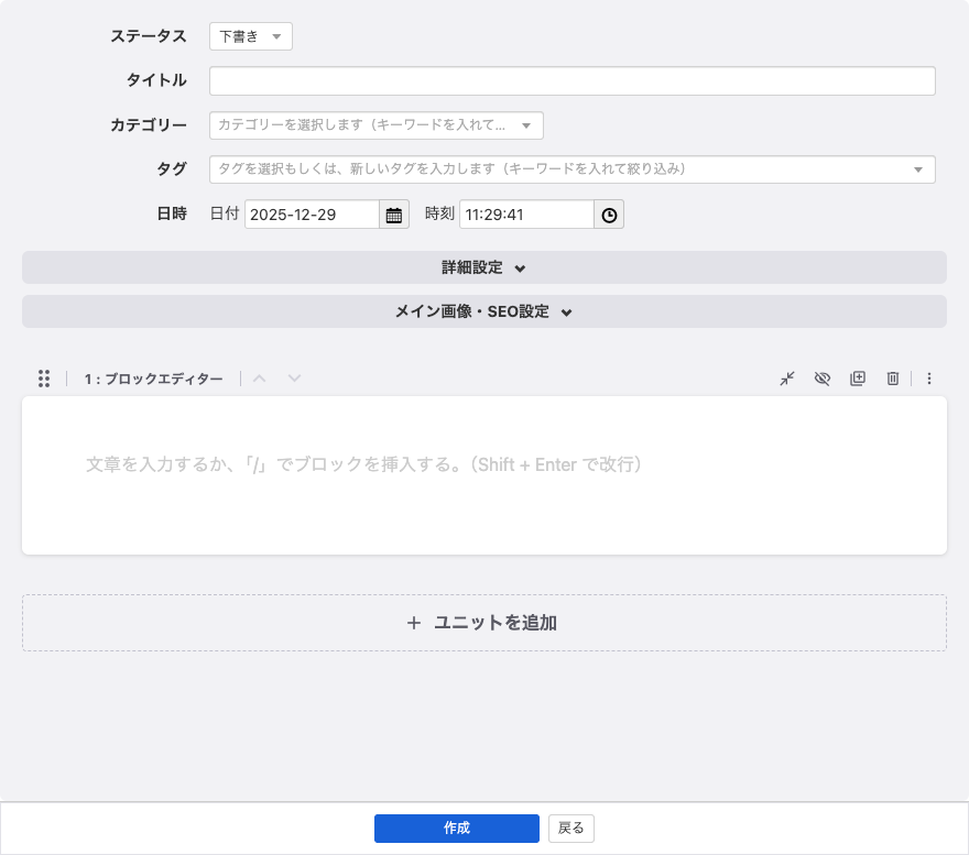 バージョン 3.2以上で制作された a-blog cms のサイトの初期状態では、エントリーを新規作成すると「ブロックエディター」ユニット、その下に[+ユニットを追加]ボタンがあります。ブロックエディターユニットでは、テキスト、画像、ファイルなどの様々なコンテンツを「ブロック」として追加し、閲覧画面と共通の見た目で、様々に編集、レイアウト、並べ替えをすることができます。このユニットだけでエントリーを作成するのにコンテンツのほとんどを入力可能です。