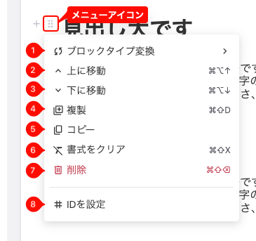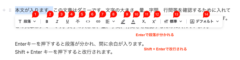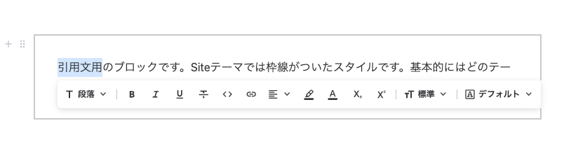 ※ テキストメニューは「段落」だけではなく、その他のテキスト系ブロック(リスト、番号月リスト、見出しなど)でも使用できます。