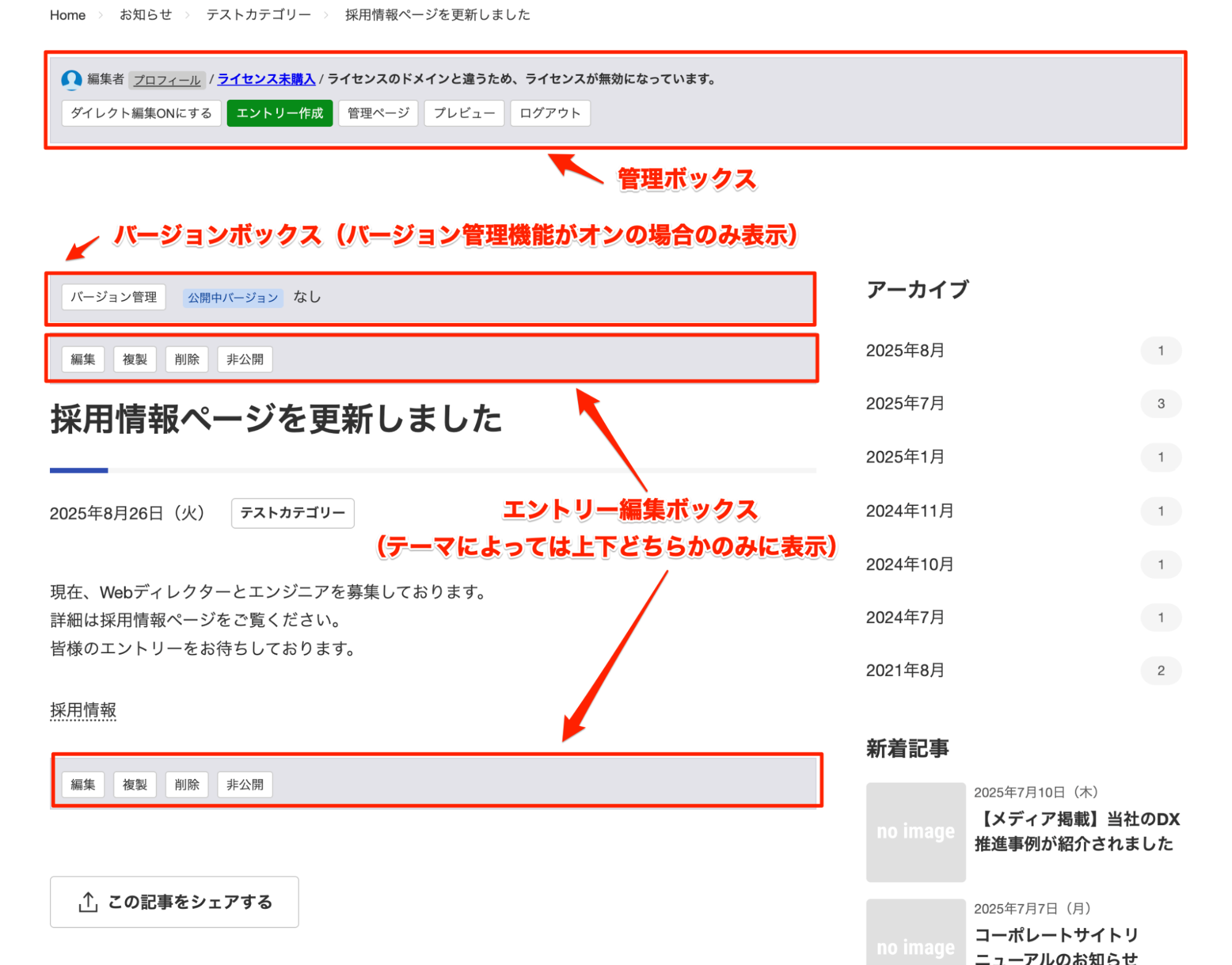 下の画面は閲覧画面の「エントリー詳細」です。ログインした状態では、「管理ボックス」「バージョンボックス」「エントリー編集ボックス」といったパーツが、閲覧画面側にも表示されます。