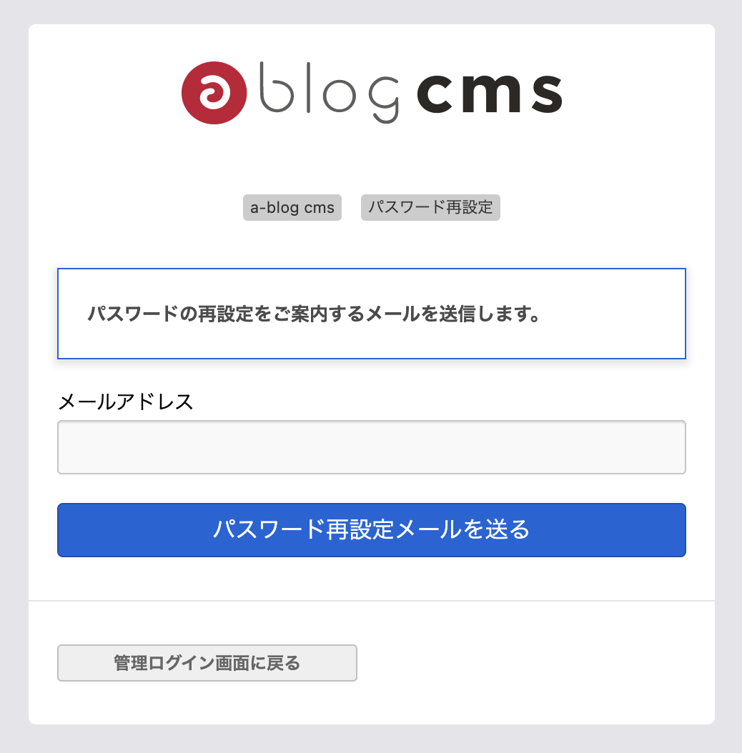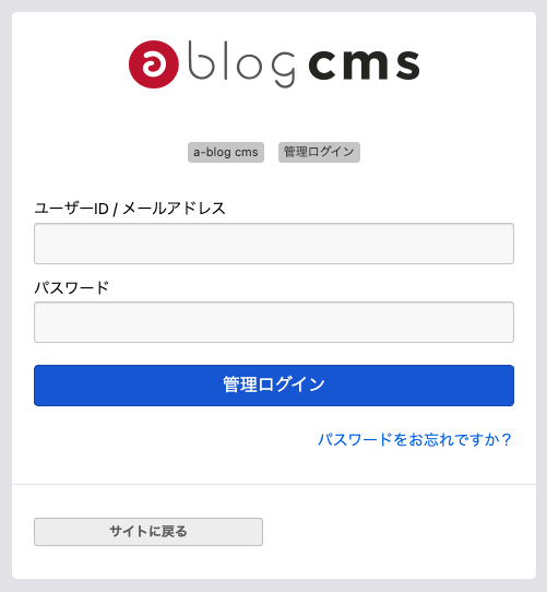 a-blog cmsでエントリー(記事)を追加・更新するためには、ログインする必要があります。 ログイン画面のURLは、下記のとおりです。