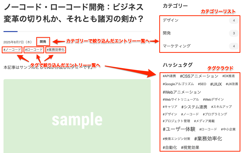 閲覧画面側では、カテゴリーやタグはエントリー一覧、エントリー詳細等の画面に表示されます。