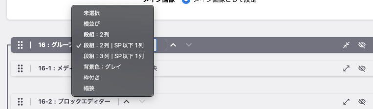 「グループ」右側のセレクトメニューから設定を選択します。