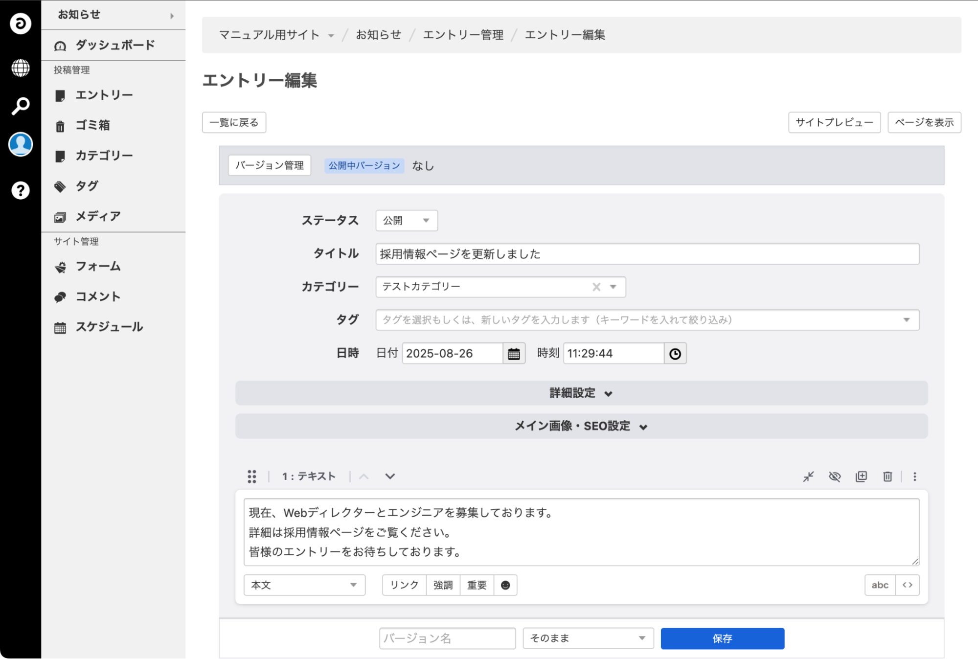 下の画面は個々の「エントリー編集」です。「詳細設定」「メイン画像・SEO設定」は開閉可能です。