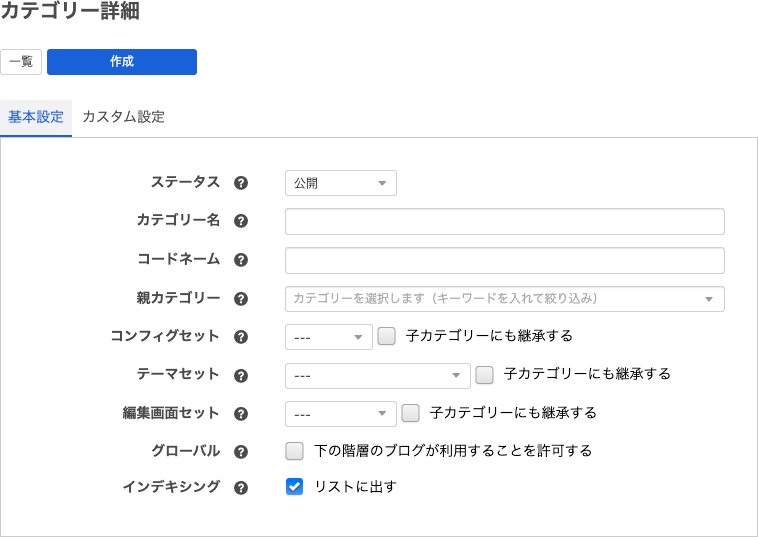 カテゴリー詳細画面において、必要な項目を入力して[作成]ボタンをクリックします。
