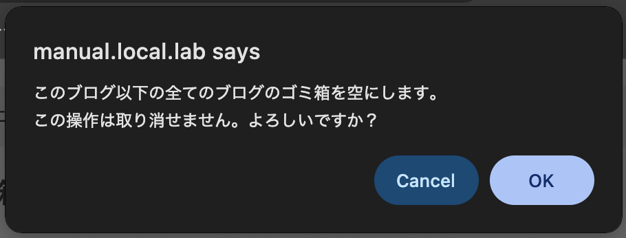 また[ゴミ箱を空にする]をクリックすると、確認のダイアログが表示され、[OK]をクリックすると今いるブログ以下のすべてのゴミ箱が空になります。