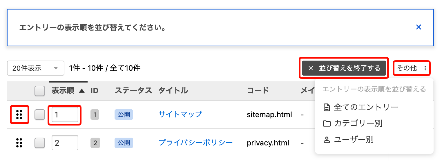 閲覧画面に日時等ではなく「表示順」で並ぶモジュールがある場合、[その他]をクリックして表示順を変更することができます。左端のドラッグハンドルをドラッグしたり、表示順を数値で入力したあと、[並び替えを終了する]をクリックしてください。