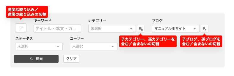 エントリー管理画面に表示するエントリーを絞り込みます。キーワード、カテゴリー、ブログ、ステータス、ユーザーを入力、選択し、「検索」ボタンをクリックすることで絞り込み、「クリア」をクリックすることで検索条件をクリアすることができます。