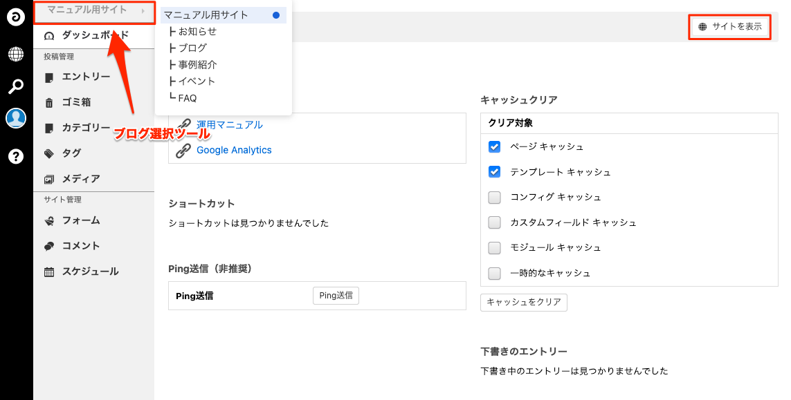 下の画面は[管理ページ]ボタンをクリックすると表示される「ダッシュボード」です。左上のブログ選択ツールからブログを選択することができます。右上の[サイトを表示]ボタンをクリックすると今いるブログのトップページに移動します。