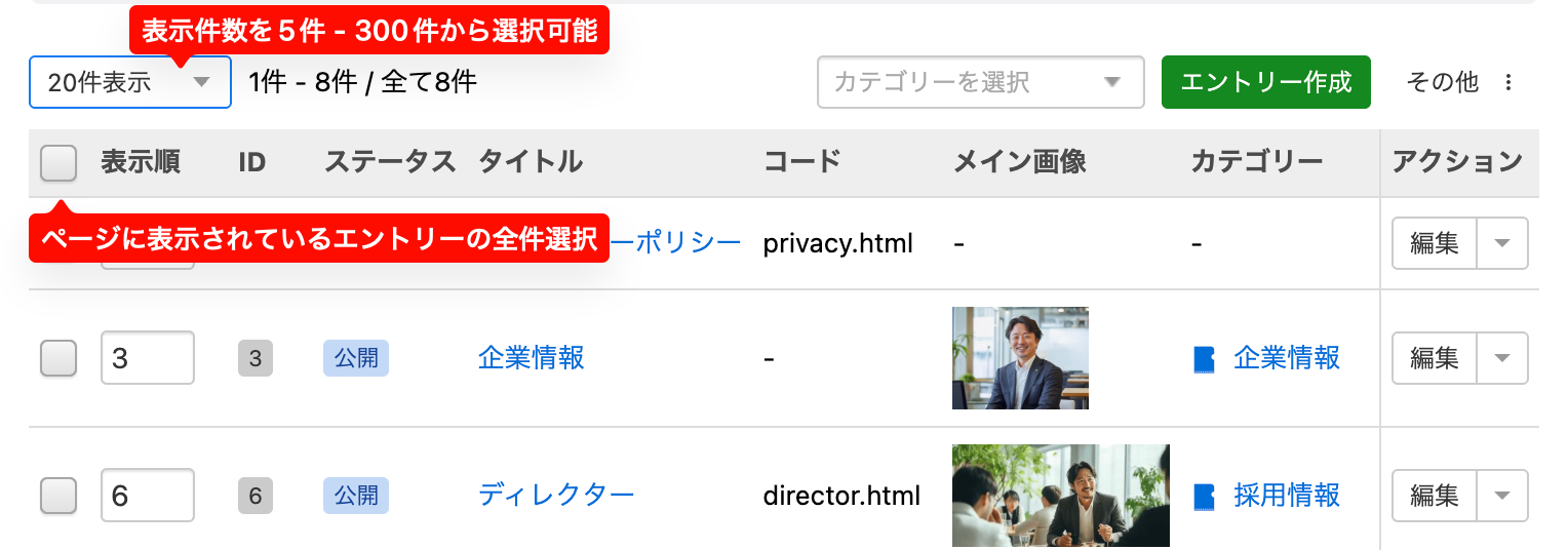 エントリー管理画面のエントリー一覧の左上にあるセレクトメニューから、表示件数を選択できます。