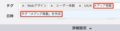 エントリーの登録または変更画面で、タグ入力欄にキーワードとなるテキストを入力し、『タグ「〇〇」作成』をクリックして新規タグを作成します。