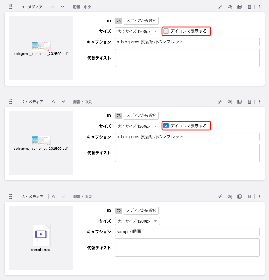 初期状態でファイル名になっているキャプションを編集することができます。また、アイコンのAlt(代替テキスト)も編集できます。 - 配置