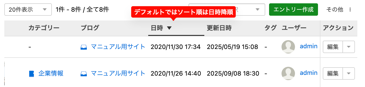 エントリー一覧のテーブルヘッダーの部分にマウスオーバーすると、ソートキーとして設定可能な項目では上または下に黒い線が表示されます。クリックすることで、管理画面でのソートキーを変更可能です。現在のソートキーである項目を再度クリックすると、降順/昇順を切り替えることができます。