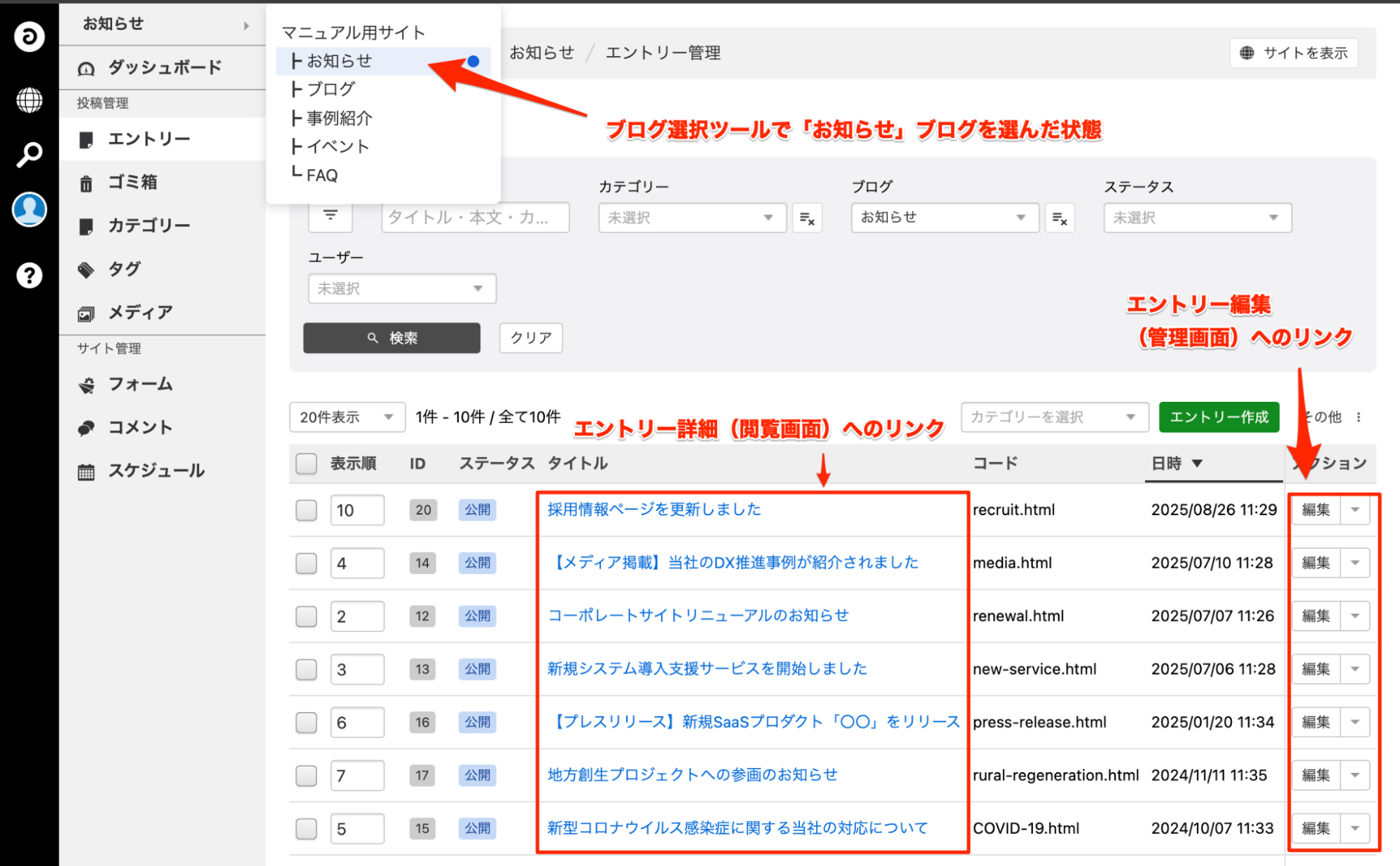 まずは、エントリー作成、更新に関連の深い画面や部分の名称をご説明します。