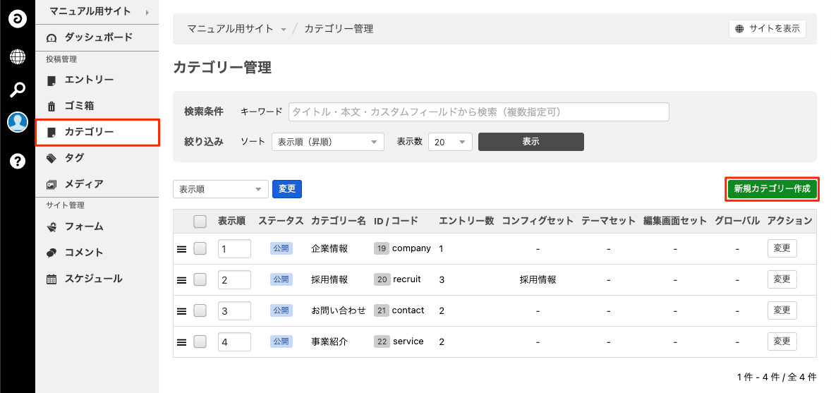 新たにカテゴリーを追加する場合は、左メニューの[カテゴリー]をクリックし、カテゴリー管理画面で[新規作成]ボタンをクリックしてカテゴリー詳細画面に移動します。