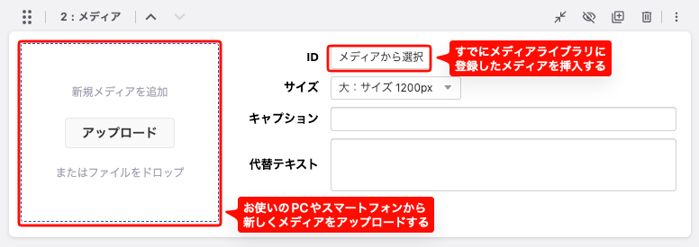 画像ブロックは、メディアから選択、あるいはパソコン、スマートフォンなどの端末からアップロードして追加できます。