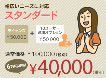 スタンダードライセンス(50,000円)と+10ユーザー追加オプション(50,000円)のセットで、通常100,000円のところ40,000円(税別)でご提供いたします。