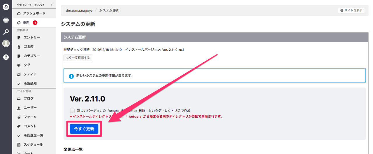 設置したサイトのCMSにログインし、管理画面に入り、「更新」ページに移動します。
