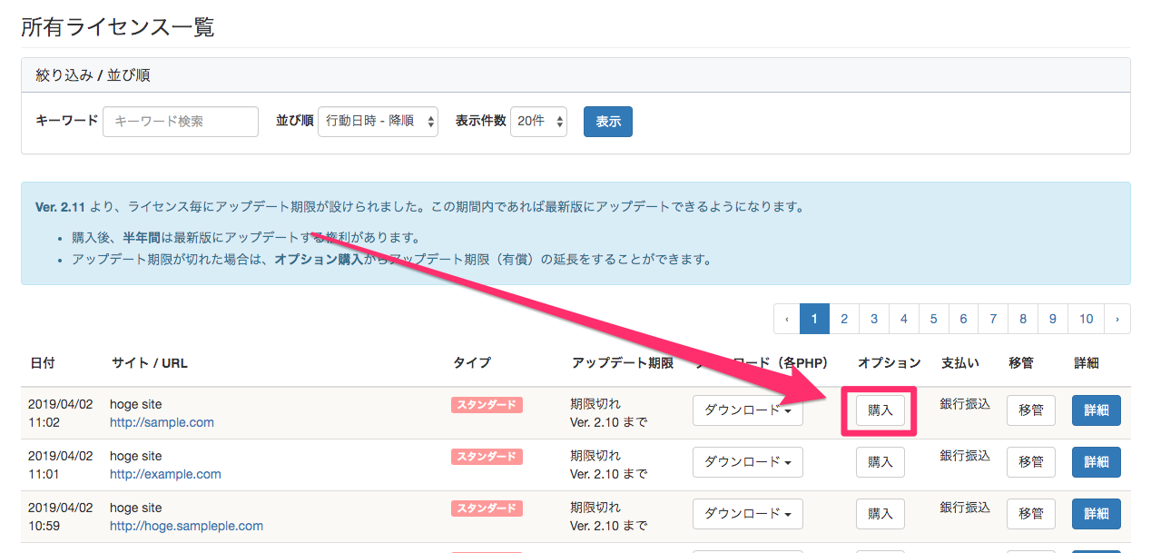 一覧からバージョンアップしたいサイトを探し、オプション項目の「購入」ボタンをクリックし、オプション購入ページへ移動します。