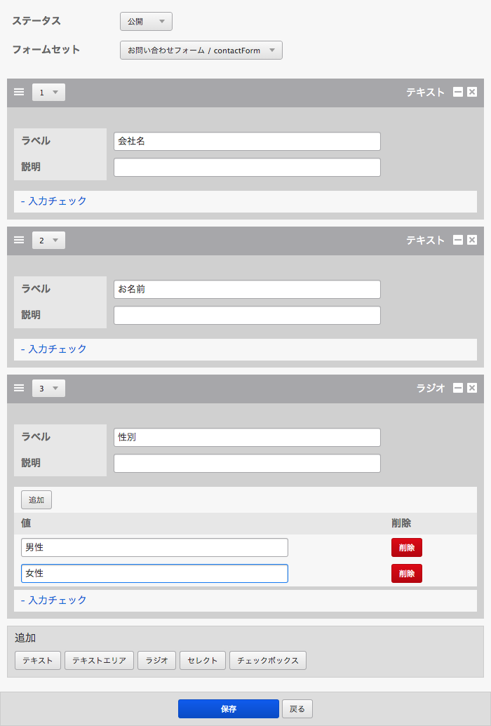 テキストや画像を追加するように、テキストエリアやラジオボタン、チェックボックスなどフォームの要素をブラウザから追加できます。各要素には必須チェックや形式チェックなど便利な入力チェックも用意しています。