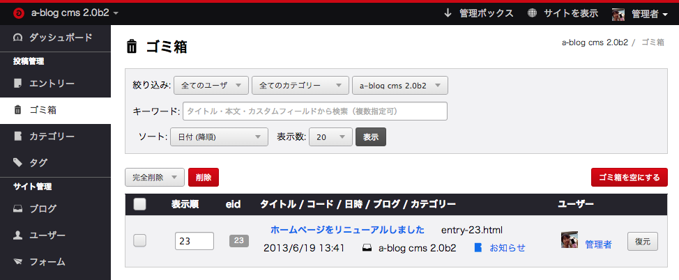 誤って削除してしまった場合でも、バージョンを含めたエントリーの情報がゴミ箱に残っていますので、復旧できるようになりました。ゴミ箱の中にあるエントリーは一括削除も可能です。