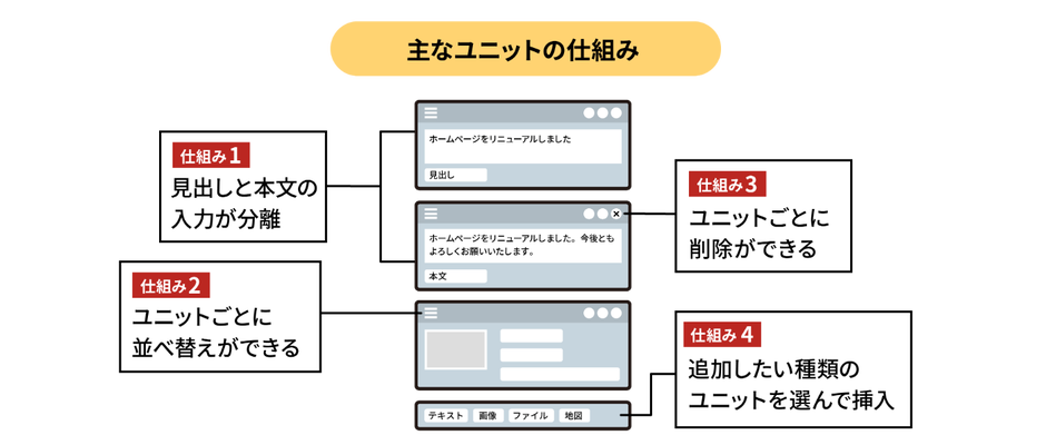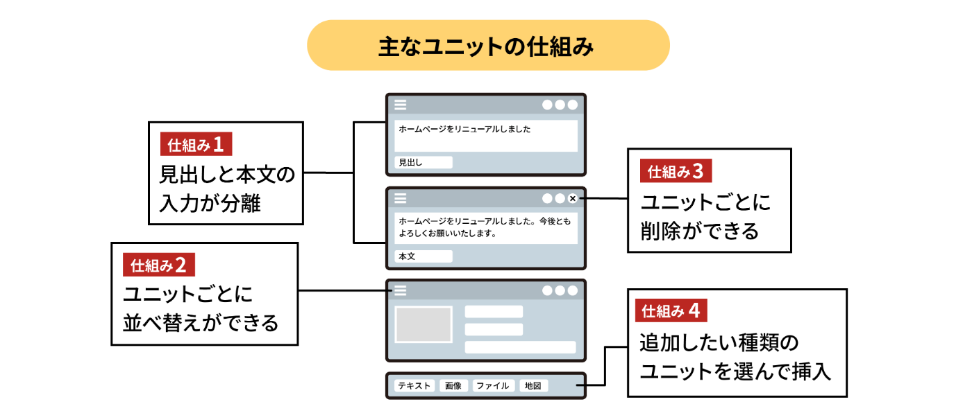 クライアントだけでなく Web 制作者の立場としても、他の CMS のように一つのテキストボックスに HTML タグを書いていく必要がない仕組みに魅力を感じました。