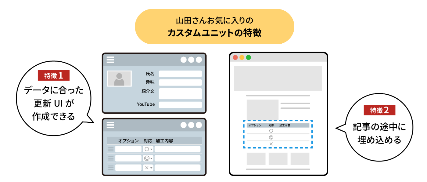 たとえばスタッフ紹介のページなら、氏名・趣味・紹介文・YouTube リンクといったシンプルで見やすい構成にこだわったり、木材加工メーカーの製品紹介ページなら、材質・加工の種類などの細かな項目を表組みにして○☓で表示させたり。カスタムユニットは記事の途中にも埋め込むことができて便利です。