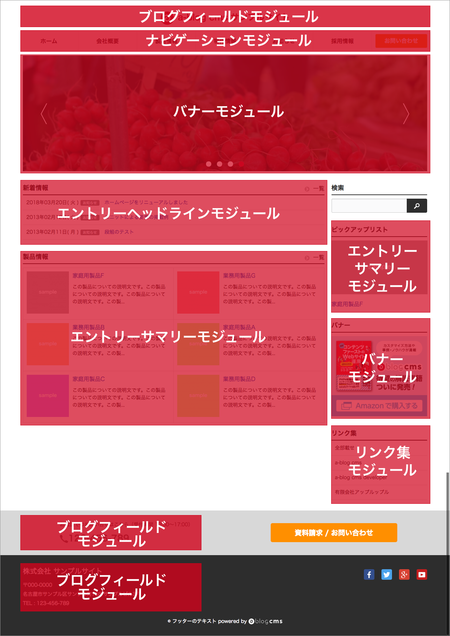 上図の左側がトップページのキャプチャです。右側に各モジュール名を示しました。このように、ほとんどのパーツがモジュールでできています。