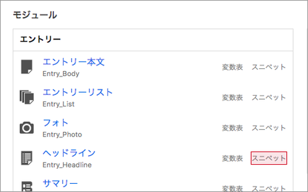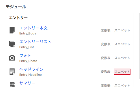 各モジュールの右側にある「スニペット」をクリックすると、モジュールのスニペットが表示されます。これをコピーします。