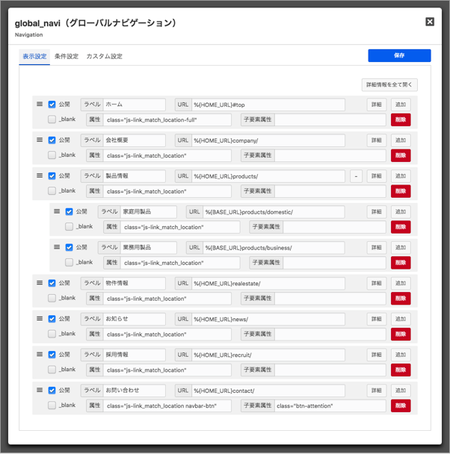 a-blog cmsのナビゲーションモジュールはリンク先を「URL」の欄に直接入力するので、WordPressの「外観 > メニュー」の「カスタムリンク」に似ていると言えます。li要素やa要素の属性も「属性」や「子要素属性」の欄に直接入力します(※2)。もちろん、class属性だけでなく他の属性も必要に応じて追加可能です。管理画面から設定できるURLや属性以外のソースについても、テンプレートはHTMLで構成されているのでカスタマイズは簡単です。