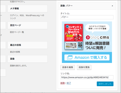 WordPressではバージョン4.8からウィジェットに「画像ウィジェット」が加わり、サイドバーのバナーを管理画面から編集できるようになりました。設定項目はウィジェットのタイトルと画像、リンク先のみです。また、ウィジェットはサイドバー以外の箇所にも表示できますが、a-blog cmsのモジュールほど手軽にテンプレートに貼り付けられるわけではありません。