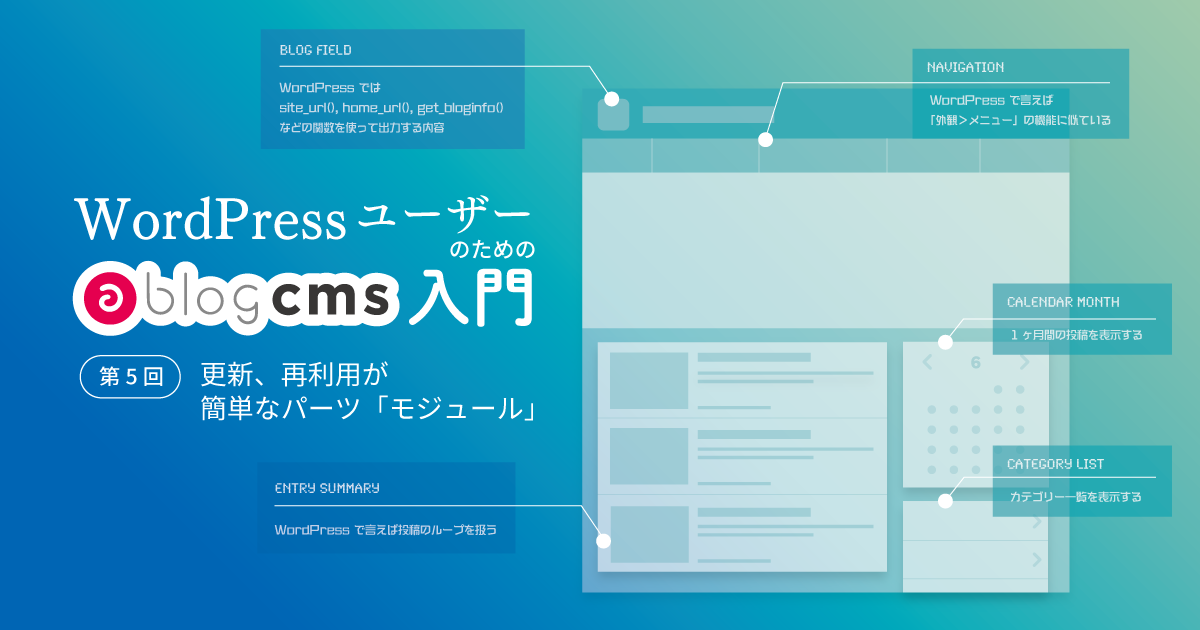 WordPressユーザーの皆さんこんにちは。WordPressユーザーを対象にa-blog cmsの基礎を解説するこのシリーズも残すところあと2回となりました。今回はWordPressにはない機能である「モジュール」を 取り上げます。第1回で解説した「ユニット」はエントリーのコンテンツ内容をパーツとして扱う機能ですが、「モジュール」はそれ以外の部分をパーツとして扱う機能です。