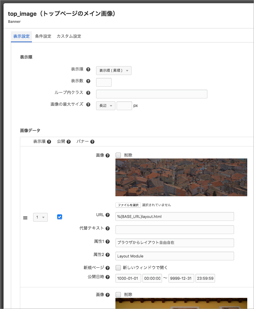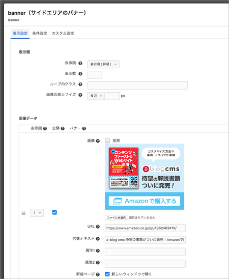 a-blog cmsの場合はバナーにはバナーモジュールを使用します。バナーは複数設定でき、並べ替えも可能です。それぞれのバナーの設定項目には画像とURLの他に代替テキストや任意に使用できる変数である属性、「新しいウィンドウで開く」チェックボックスなどの項目が一通り揃っています。また、「公開」チェックボックスのチェックを外して一時的にバナーを非公開にすることや、「公開日時」で期間を設定することも可能です。