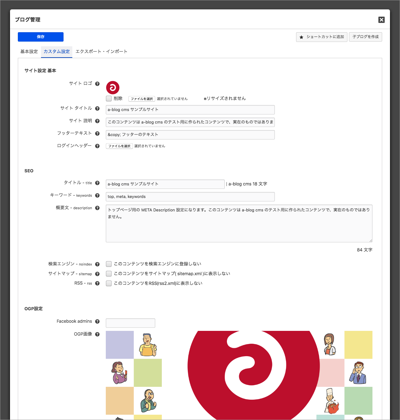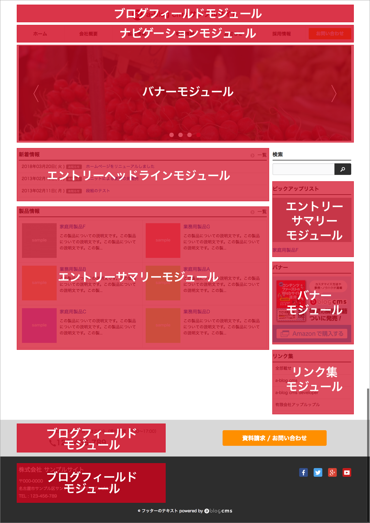 ヘッダーのロゴやタイトルの部分、フッターのお問合せ情報や会社情報の部分はブログフィールドモジュールです。a-blog cmsの公式テーマでは、こういったブログ全体に関する情報は「ブログ管理」にまとめられています。そして、ブログフィールドモジュールはこの「ブログ管理」の情報を取得して表示しています。
