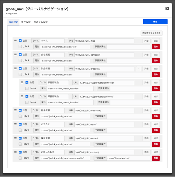 ※2:初期状態で「属性」欄にある「js-link_match_location-full」や「js-link_match_location」というclass属性はWordPressで言えば「current-…..」の判定に使われていて、条件に合致した場合「stay」というclass名がJavaScriptによって付加されます。