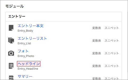 テンプレートファイルのモジュールを使いたい箇所にスニペットをペーストし、モジュールIDを設定します。たとえばエントリーヘッドラインモジュールのスニペットは