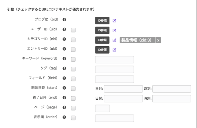 「条件設定」の引数には「チェックするとURLコンテキストが優先されます」と書かれています。URLコンテキストとは、URLによって決定する条件のことです。WordPressではURLによって発行されるクエリは「メインクエリ」と呼ばれますが、URLコンテキストはメインクエリと似ています。WordPressではメインクエリによって生成されたメインループと、それ以外のサブループの区別が重要ですが、a-blog cmsではモジュールは独立して扱われるのでループが混乱するようなことはありません。また、ループ全体ではなく、引数それぞれについてURLコンテキストを優先するか、IDを指定するかを設定できます。