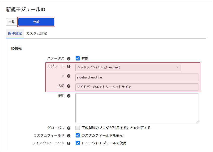 - モジュールIDを作成すると、下の階層のブログでも利用できるようにグローバル化したり、個別のモジュールとして設定することが可能になる