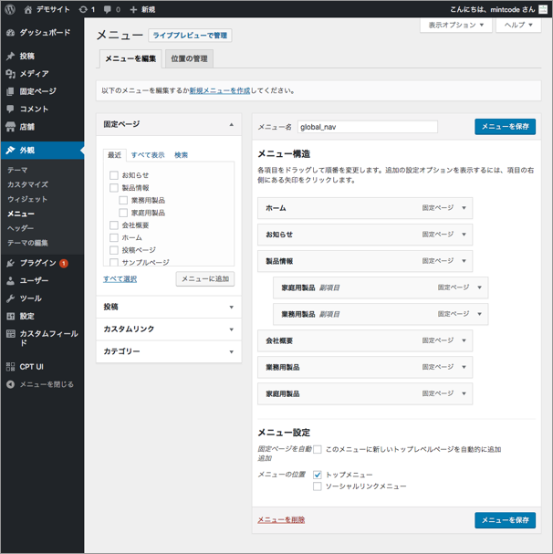 ナビゲーションモジュールはWordPressの「外観 > メニュー」の機能に似ています。