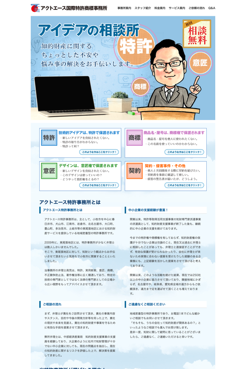 アクトエース国際特許商標登録事務所 http://www.actace.com クライアント名 アクトエース国際特許商標登録事務所 制作 有限会社シーエスプラス 愛知県小牧市のアクトエース国際特許商標登録事務所様では、大手の特許事務所ではできないような、きめ細かな対応をしていただけます。 #その他