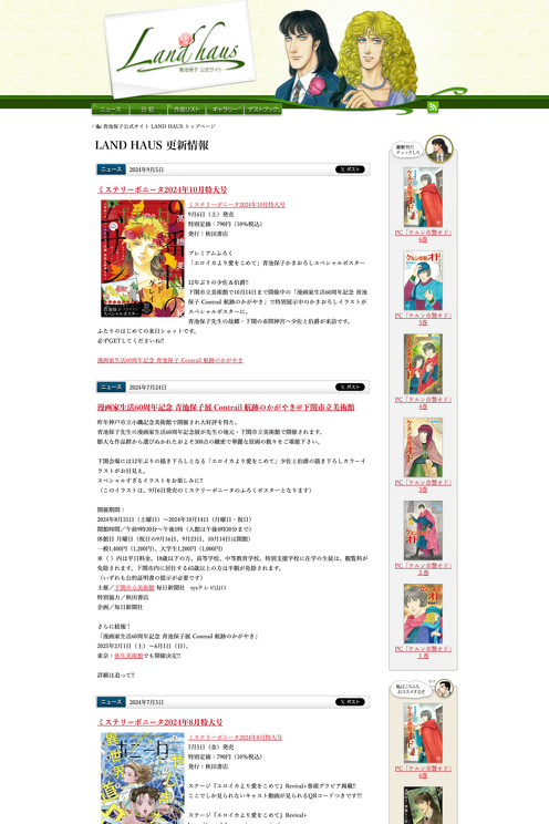 「エロイカより愛をこめて」などの作品で知られる、漫画家の青池保子先生のサイトをリニューアルさせていただきました。独自のプログラムで管理されていた日記やニュース、静的ページの作品リストなど、過去のデータの引き継ぎが必要でしたが、カスタムフィールドとインポート機能を活用して、比較的手間なく再構築することができました。機能的にも内容的にも、非常に評価をいただいております。