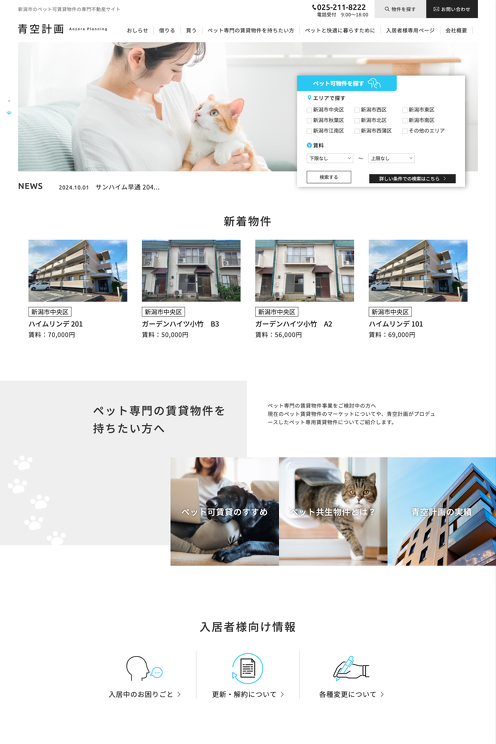 新潟市西区の青空計画様では、ペットフリー賃貸物件の総合管理請負業及び企画・コンサルティング業に取り組まれています。制作したWebサイトは社名の青空をイメージさせるデザインにし、賃貸物件の簡易検索・詳細検索機能や、入居者様のための契約申請フォームを取り付けました。また物件詳細ページで「この物件を問い合わせる」ボタンをクリックすると、お問い合わせフォームの「対象の物件名」に物件名が自動で入力されるようになっています。さらに、物件情報やトピックス、「ペットと快適に暮らすために」については子ブログを設置し、青空計画様で簡単に更新できるようにしました。