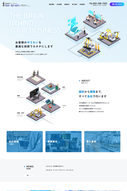 株式会社ビー・ブレイン様のホームページを制作いたしました。 同社は、大手自動車メーカー様をはじめとする各種製造業者様向けに、コンピュータシステムや制御システムの設計・開発・提案を行っておられます。 言葉だけでは伝わりにくいシステムの内容を、イラストを用いて視覚的に分かりやすく表現しました。 導入事例のページでは、工場内の各装置のイラストをクリックすると、使用されているシステムの説明がポップアップ表示される仕組みになっており、どの場所でどのようなシステムが導入されているかが一目で把握できるよう工夫しています。 ビー・ブレイン様の業務内容が明確に伝わる、分かりやすく親しみやすいホームページに仕上がりました。