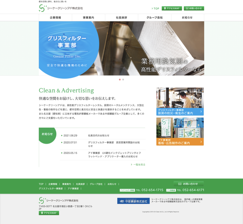 シーケークリーンアド株式会社 http://www.ck-clean-ad.co.jp/ クライアント名 シーケークリーンアド株式会社 代理店名 中根事務所 制作 有限会社シーエスプラス シーケークリーンアド様では2つの異なる事業部を展開されています。 このため、会社サイト以外に、事業部サイトも構築しています。 #その他