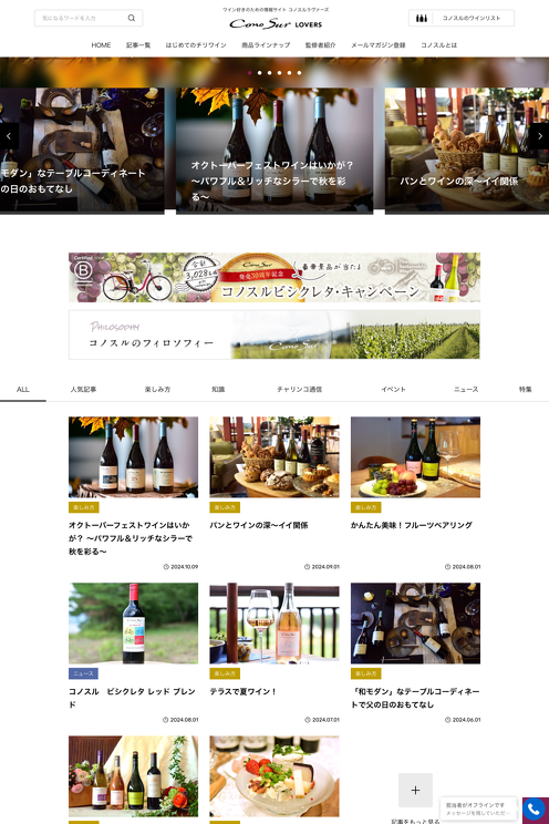 株式会社スマイル様が総輸入元を務めるチリワイン コノスルの情報発信サイト「コノスルラヴァーズ」制作を行いました。 ワイン初級者から愛好家までをターゲットとし、ワインについて知りたい情報をわかりやすく伝えるサイトです。