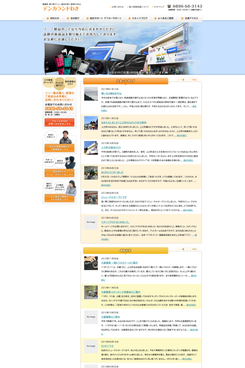 愛媛県四国中央市上分町で三代にわたり電気店を営んでおられるデンカランドわき様のホームページです。三代目の店長様を中心としたアットホームなお店の雰囲気をデザインにも反映しました。新製品やお買い得商品の情報を発信しやすいようCMSを導入しています。