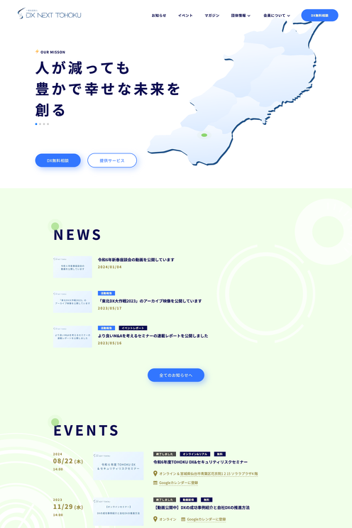 一般社団法人DX NEXT TOHOKU https://dx-tohoku.jp/ 制作 雑多制作 東北のデジタルトランスフォーメーション推進を目的に設立された一般社団法人DX NEXT TOHOKU(略称 : DNT)の公式サイトです。 お知らせの管理、イベントの管理、ランディングページの管理、執筆者の管理等など、目的別にブログを作成し、様々なご要望に柔軟に対応いたしました。 #Webサイト制作 #その他